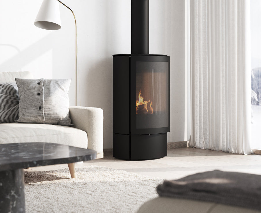 The Rais Caro 90 gas stove is a compact yet powerful heating solution, offering a maximum heat output of 31,000 BTUs. Standing 36 inches tall, its sleek, oval design makes it a stylish addition to any room while maintaining a discrete presence. The stove features a simple safety screen for added protection, and remote for easy operation, making it a very user friendly stove.